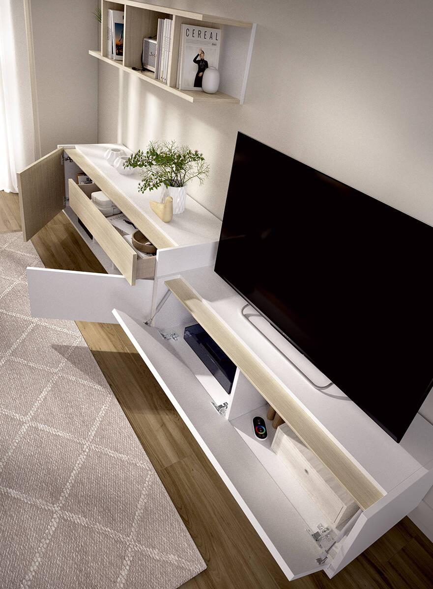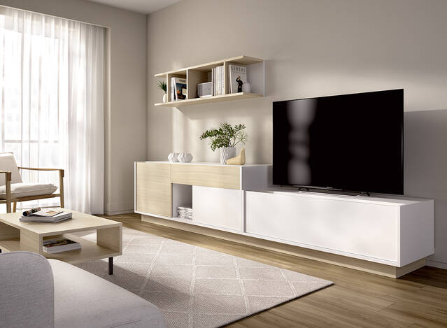 Taulers melamínics de primera qualitat resistents a ratllades i taques, reuneix les característiques segons normativa UNE-EN 14322. Gruixos de 1,9cm i 3 cm. Blegats de gruixos 5 cm. Cants de PVC de 1,2 mm i 0,4mm de gruix. FERRATGES de primera qualitat segons normatives vigents. Frontisses d'auto-tancament regulables en alçada i reforçades. Suports de prestatges ocults regulables, resistents a càrregues estàtiques i mecàniques segons indica la seva norma UNE. Guies ocultes reforçades d'extracció recta, amb autotancament i regulació en alçada. VIDRES: 6 mm transparents per a prestatges interiors i 5 mm transparents per al vidre estructural de mòduls mixtes i franja.