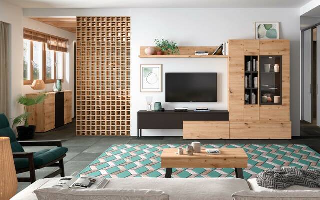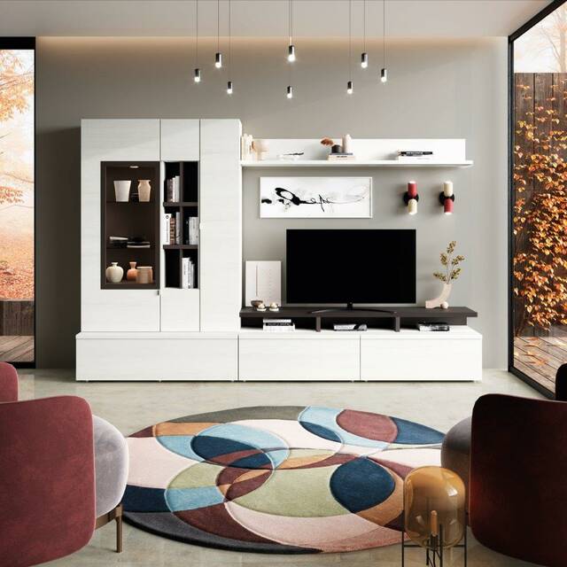 Composició modular amb vitrina, mòduls estants i mòdul 1 porta, baix TV i estanteria paret