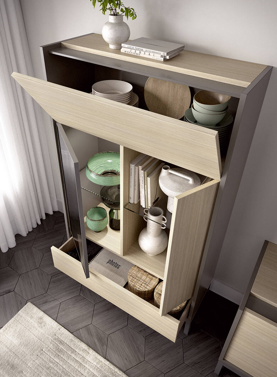 Taulers melamínics de primera qualitat resistents a ratllades i taques, reuneix les característiques segons normativa UNE-EN 14322. Gruixos de 1,9cm i 3cm. Blegats de gruixos 5 cm. Cants de PVC de 1,2 mm i 0,4mm de gruix. FERRATGES de primera qualitat segons normatives vigents. Frontisses auto-tancament regulables en alçada i reforçades. Suports de prestatges ocults regulables, resistents a càrregues estàtiques i mecàniques segons indica la seva norma UNE. Guies ocultes reforçades d'extracció recta, amb autotancament i regulació en alçada. VIDRES: 6 mm transparents per a prestatges interiors i 5 mm transparents per al vidre estructural de mòduls mixtes i franja.