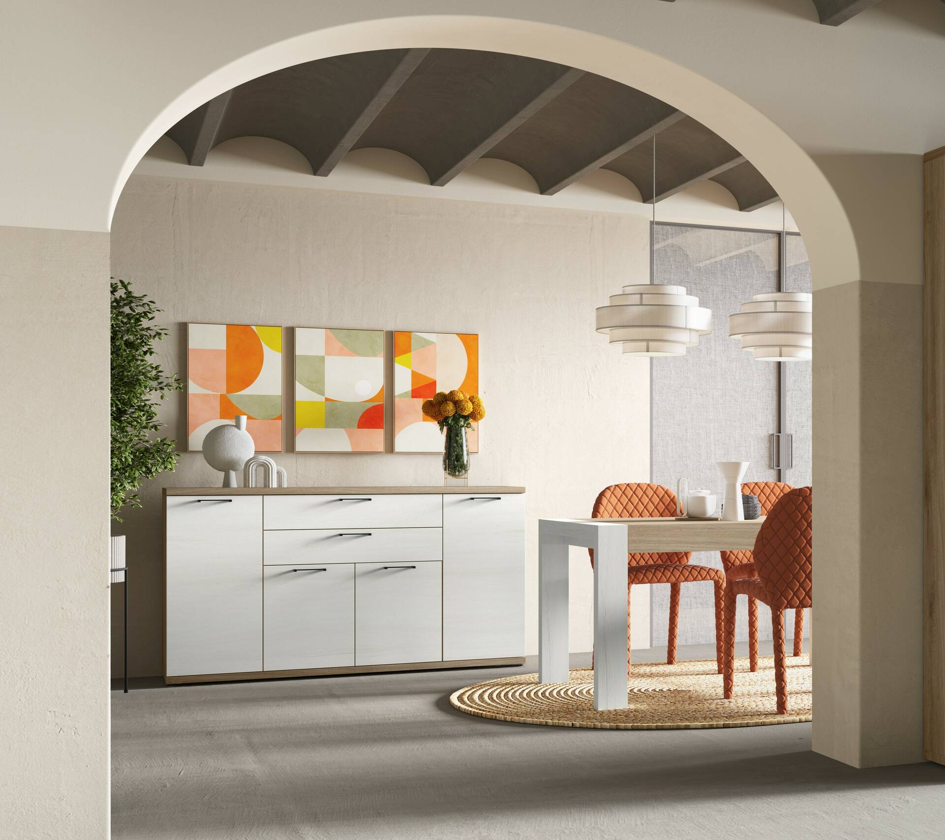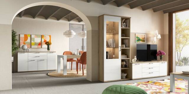 Caixes laterals, fronts, prestatges i tapes de tauler de partícules recobert de productes melamínics de 16 / 30 mm de gruix d'acord amb la normativa europea sobre emissions de formaldehid. Cargols, frontisses, guies i tiradors metàl·lics. Cant de PVC de 1,2 mm, 0,8 mm i 0,4 mm. Calaixos amb guies metàl·liques de roda amb topall. Interior de calaixos (costella) color tèxtil. Prestatges vidre gruix 5 mm amb ferramenta pelicà. Motllura de fibra de fusta