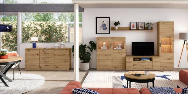 Cajas laterales, frentes, estantes y tapas de tablero de partículas recubierto de productos melamínicos de 16/30mm de espesor conforme con la normativa europea sobre emisión de formaldehido. Tornillería, bisagras, guías y tiradores metálicos. Canto de PVC de 1,2 mm, 0,8 mm y 0,4 mm. Cajones con guías metálicas de rueda con tope. Interior de cajones (costilla) color textil. Estantes cristal grosor 5 mm con herraje pelícano. Moldura de fibra de madera