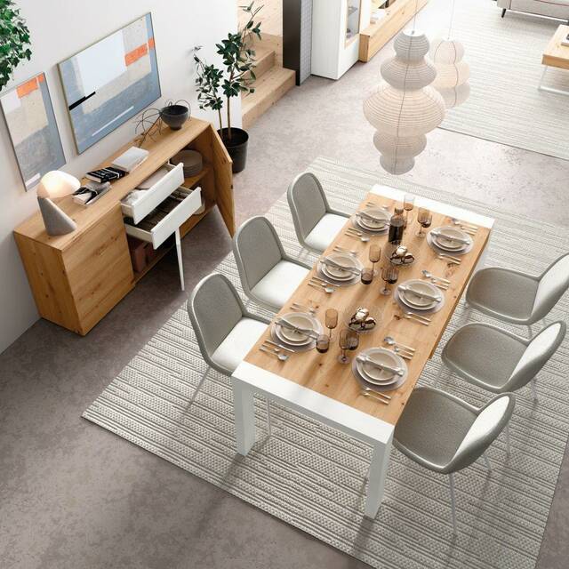 Cajas laterales, frentes, estantes y tapas de tablero de partículas recubierto de productos melamínicos de 16/30mm de espesor conforme a la normativa europea sobre emisión de formaldehido. Tornillería, bisagras, guías y tiradores metálicos. Canto de PVC de 1,2mm, 0,8mm y 0,4mm. Cajones con guías metálicas de rueda con tope. Interior cajones (costilla) color textil. Estantes cristal grosor 5mm con herraje pelícano. Uñeros / tiradores de fibra de madera