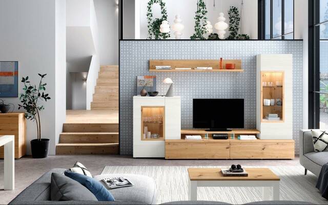 Composició modular amb vitrina baixa, baix tv amb 2 portes abatibles, soport TV, vitrina alta i prestatge decoratiu