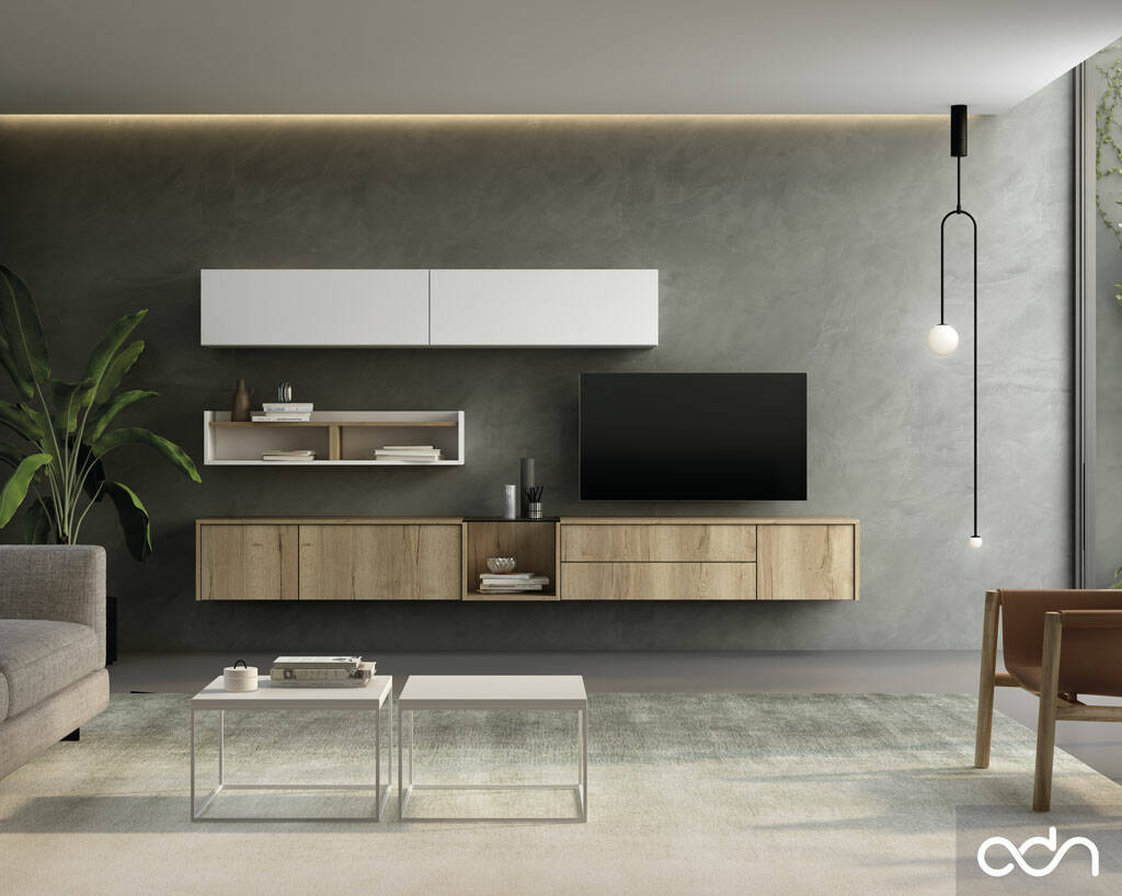 Composición moderna con módulo TV colgado y módulos pared auxiliares. Se fabrica en diferentes medidas y colores.