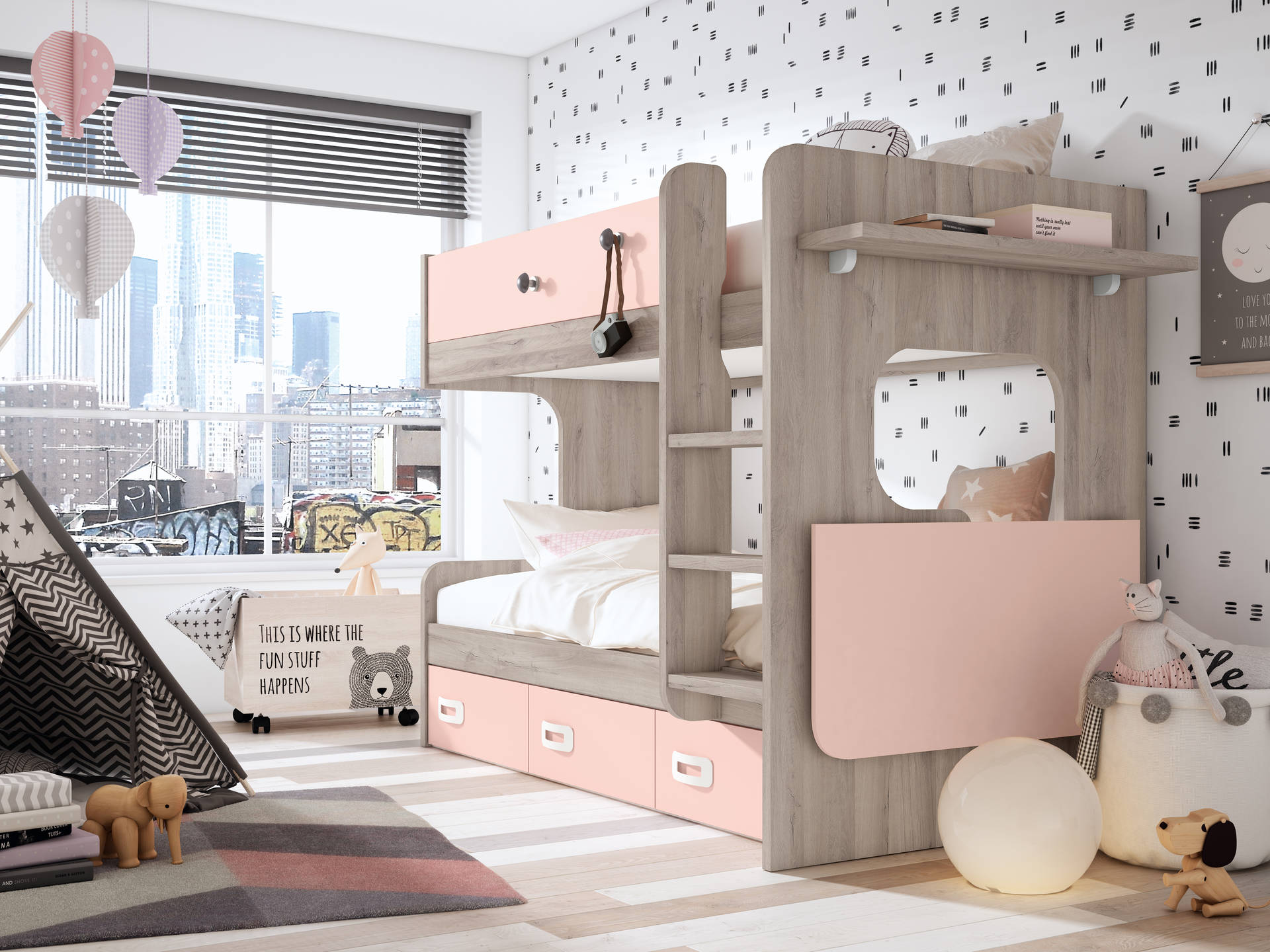 Tablero melaminizado de 16mm y 30mm. Cantos sintéticos. Puerta corredera armario con perfil en color gris. Largueros en tablero de 30mm con canto superior sintetico. Accesorios metálicos acabados en color blanco y aluminio. Guía metálica de rueda con caída para cajones. Respaldo y suplemento a color, opcional en nidos y compactos. Bisagra metálica de montaje regulable. Ruedas de nidos y camas desplazables con rodadura de goma. Interiores color blanco.