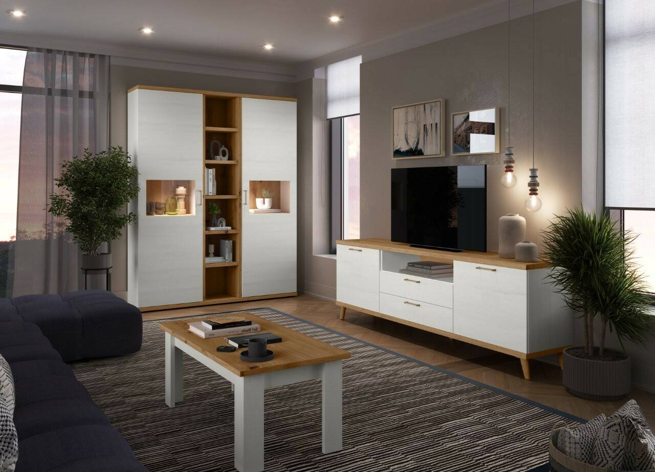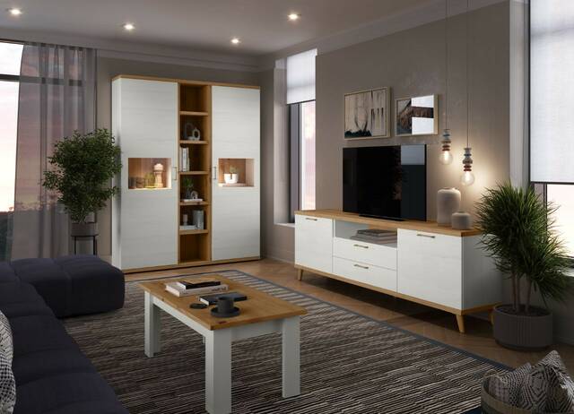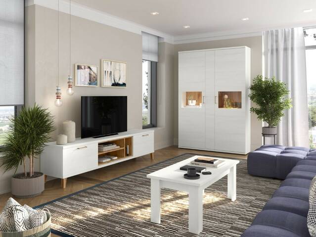 Cajas laterales, frentes, estantes y tapas de tablero de partículas recubierto de productos melamínicos de 16/30mm de espesor conforme con la normativa europea sobre emisión de formaldehido. Tornillería, bisagras, guías y tiradores metálicos. Canto de PVC de 1,2 mm, 0,8 mm y 0,4 mm. Cajones con guías metálicas de rueda con tope. Interior de cajones (costilla) color textil. Estantes cristal grosor 5 mm con herraje pelícano. Moldura de fibra de madera
