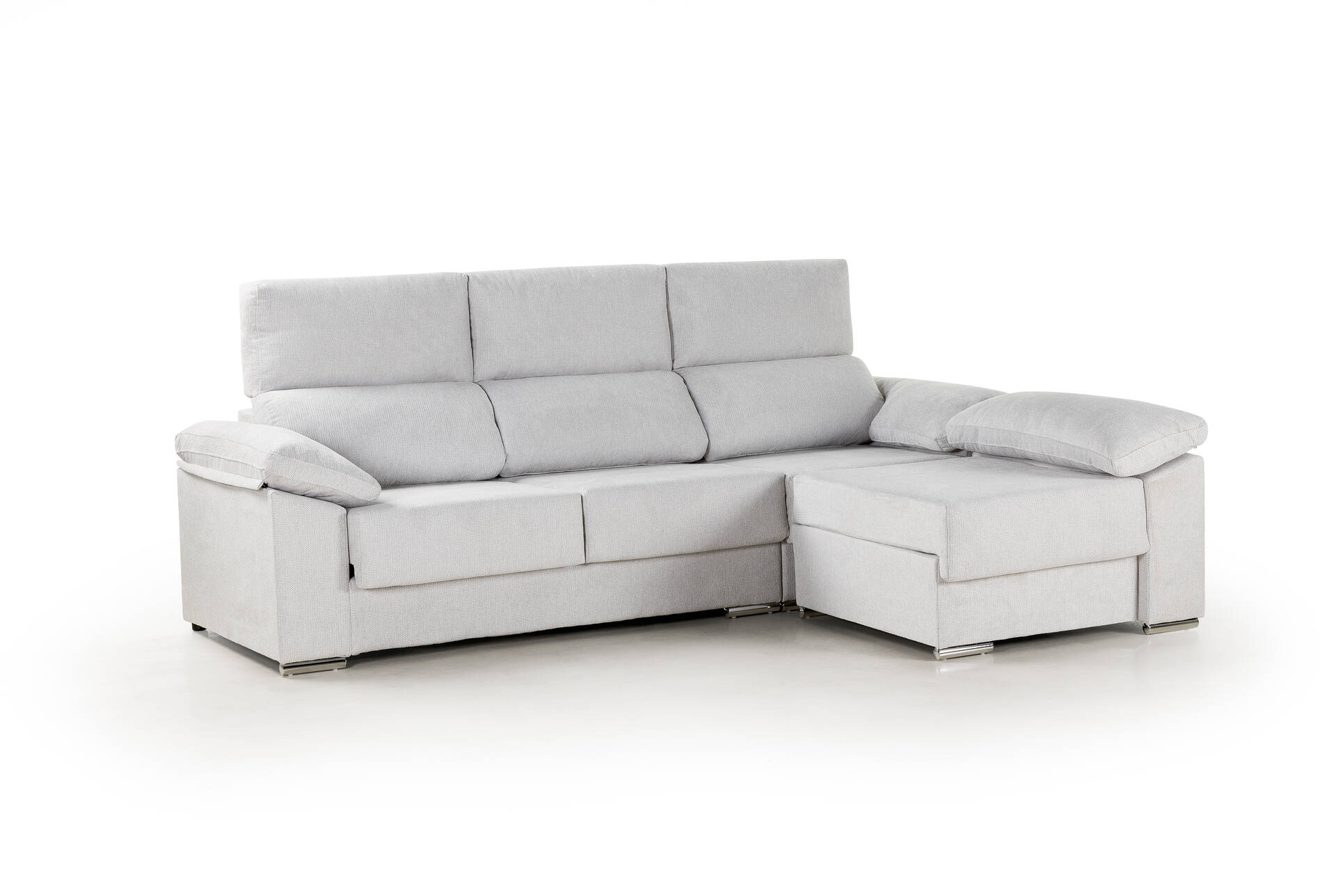 Sofá chaise-longue reversible con pouff partido. Tapizado gris.